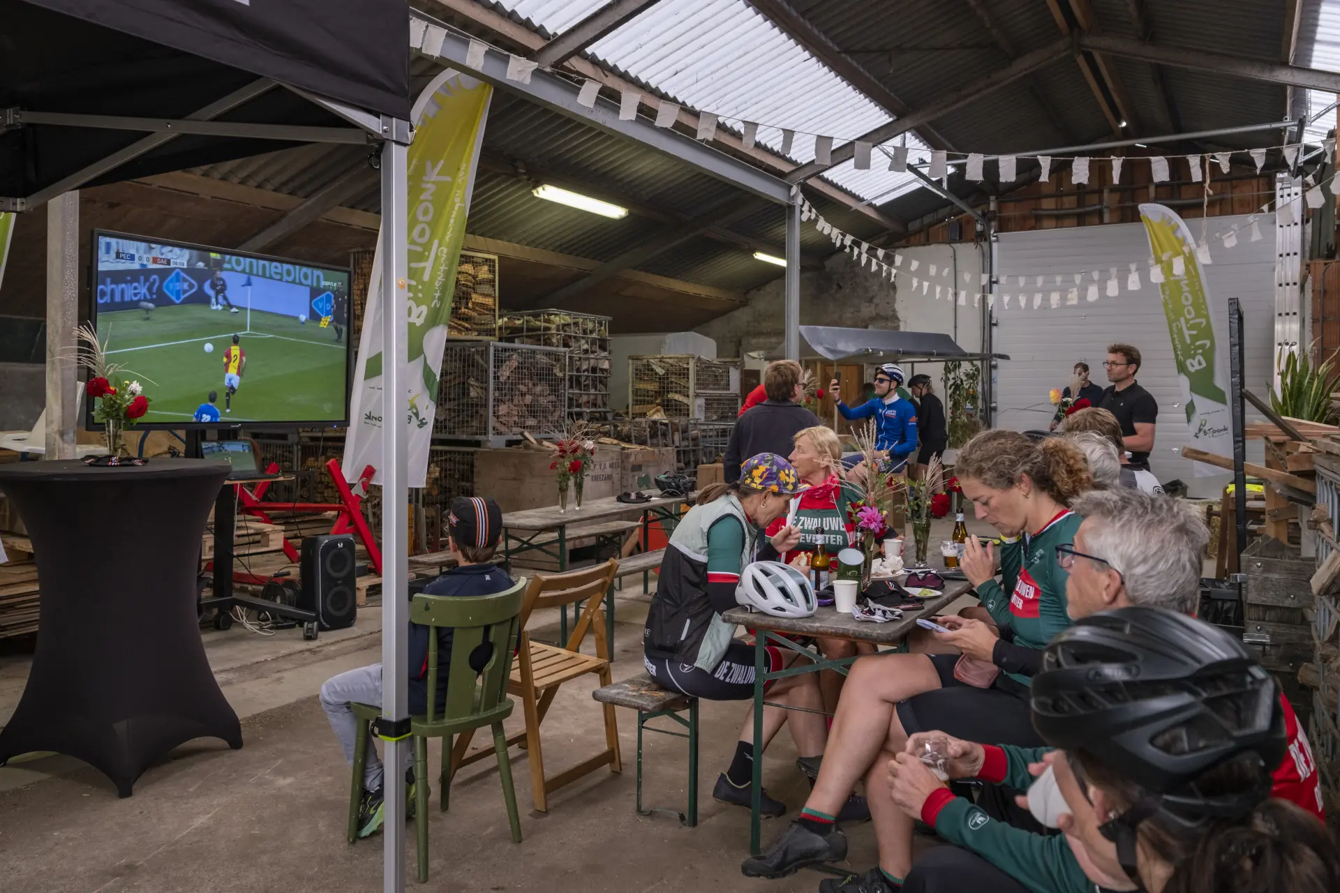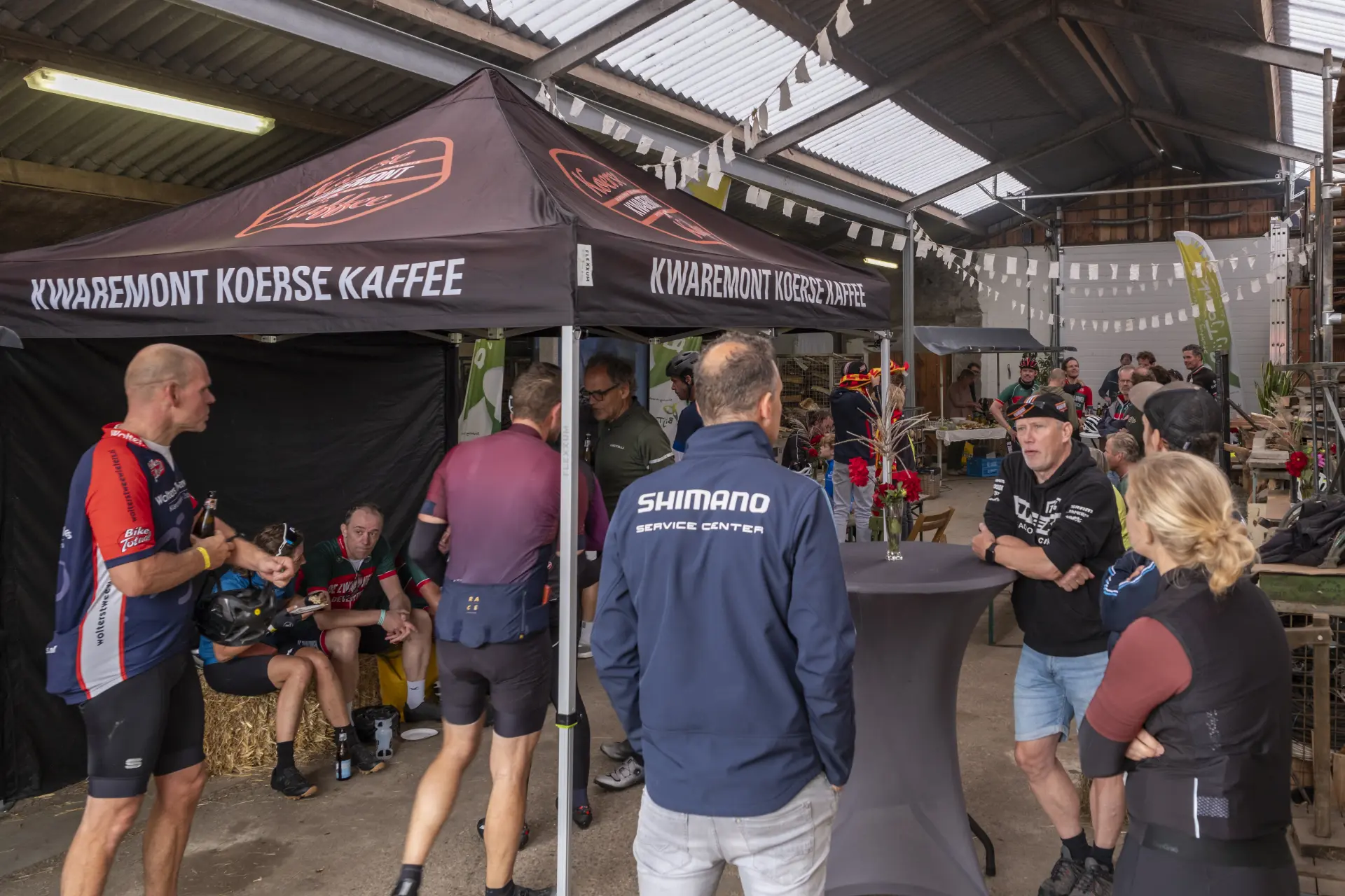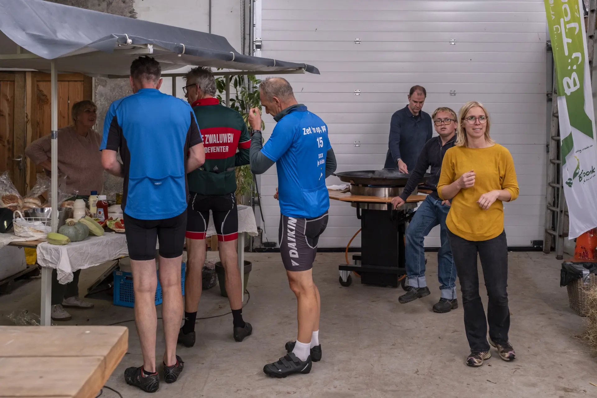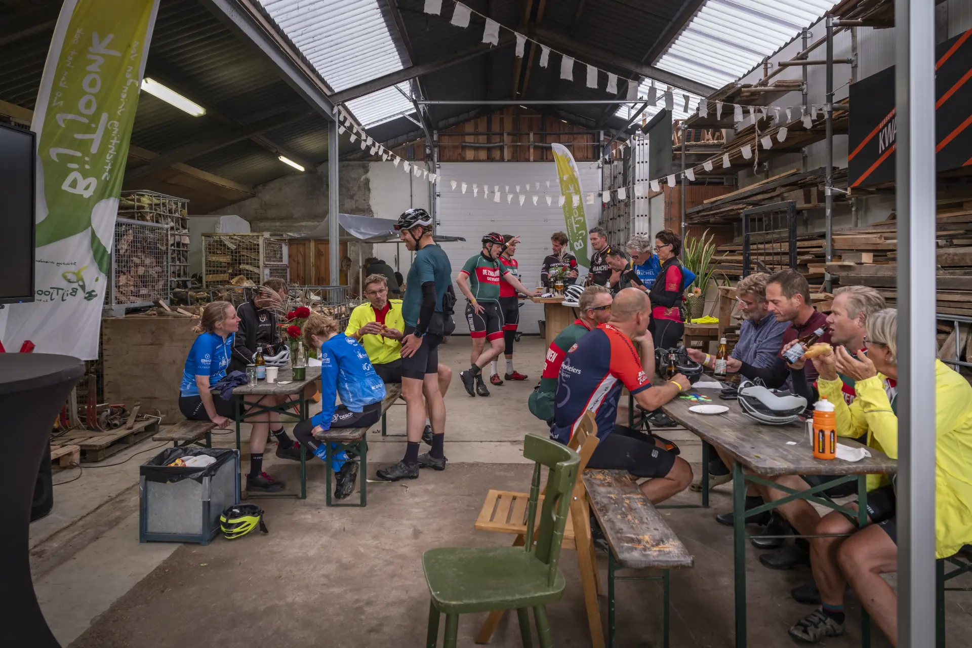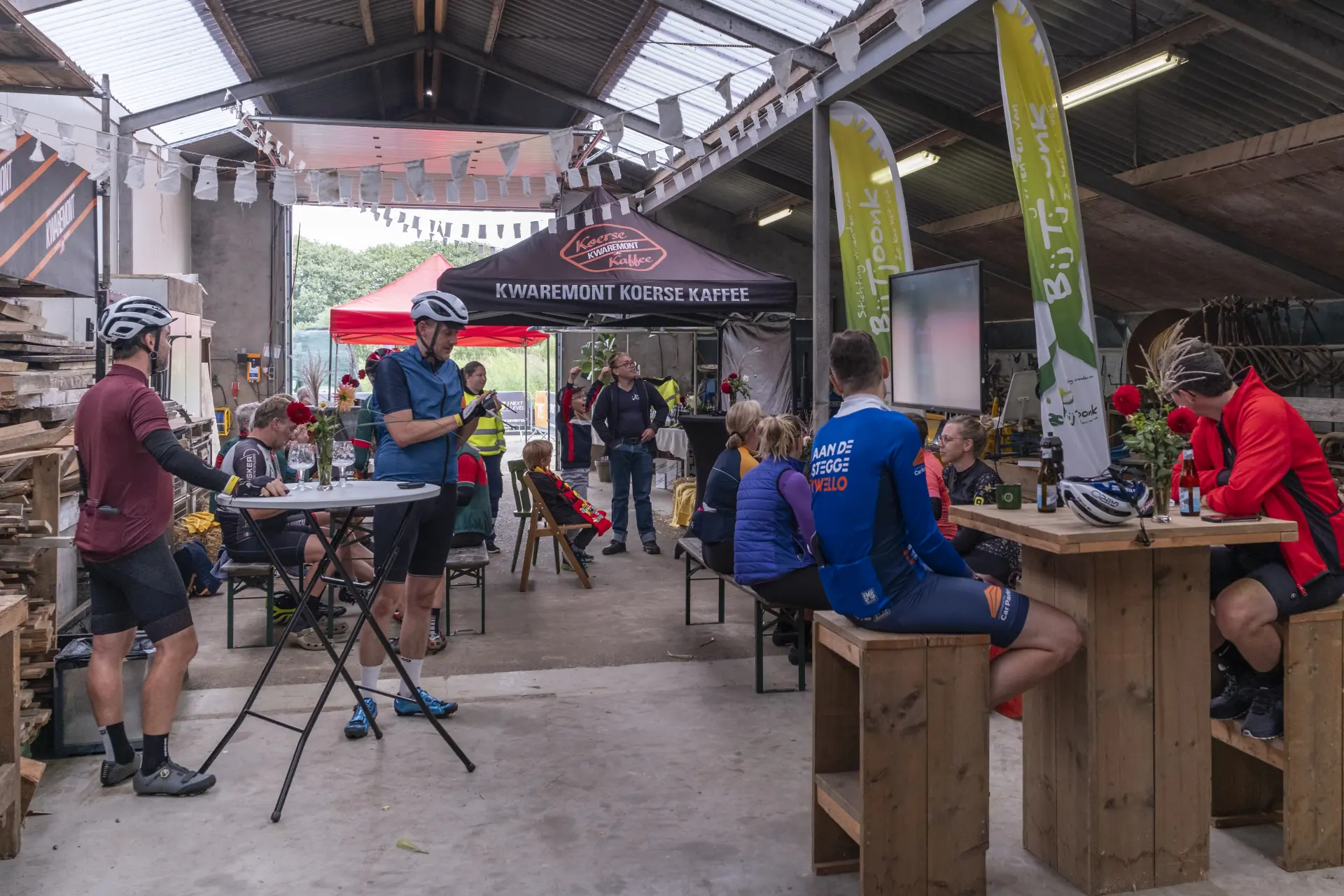 De start en finish waren dit jaar bij leer- en werkbedrijf Bij Tjoonk, waar de locatie fantastisch was aangekleed. Voor de rit eerst samen koffie drinken, na afloop gezellig napraten met live voetbal op het scherm, een drankje in de hand en een sappige hamburger van de grill.