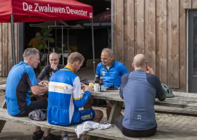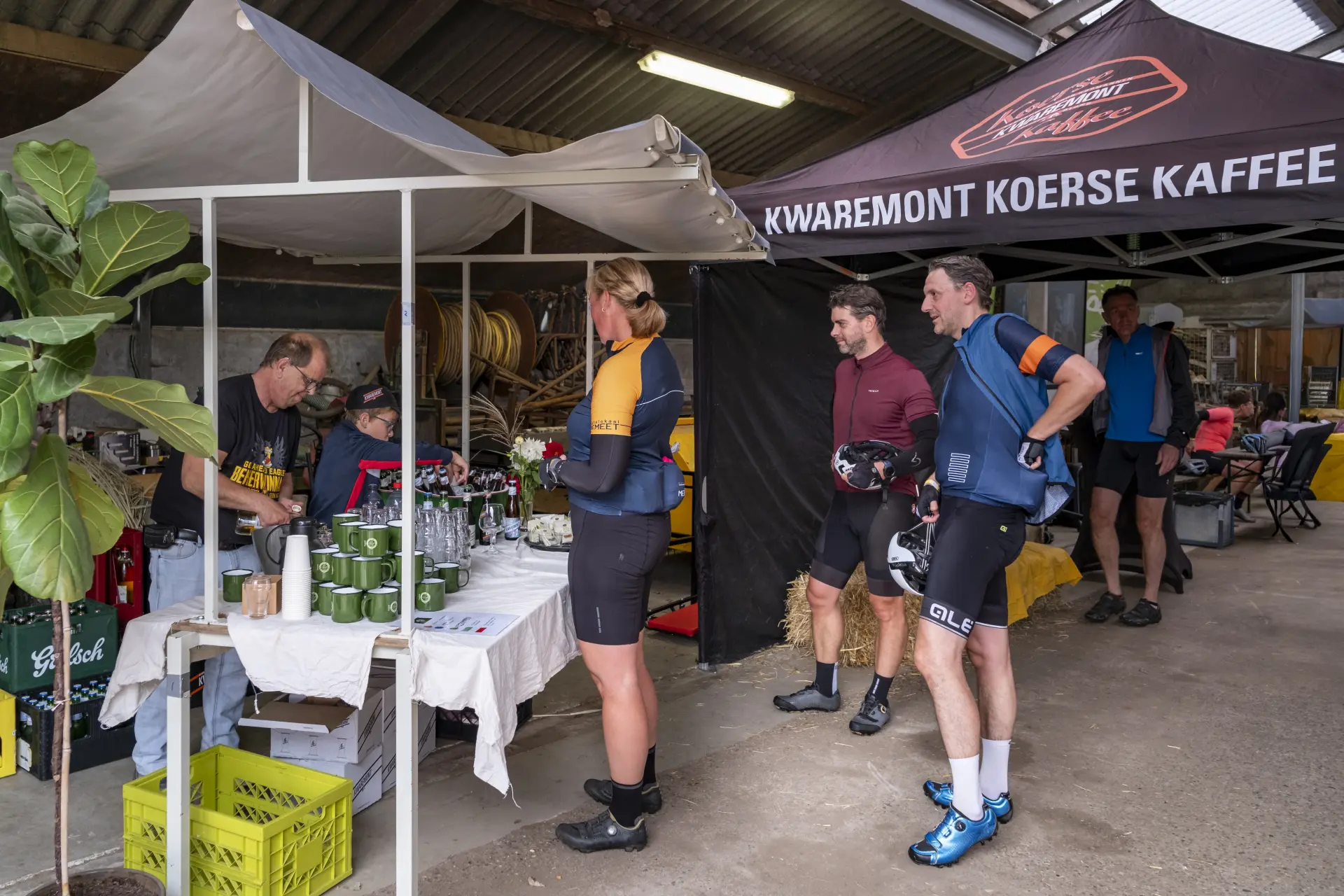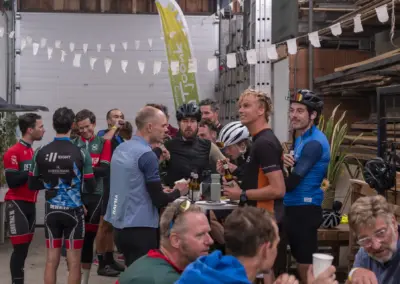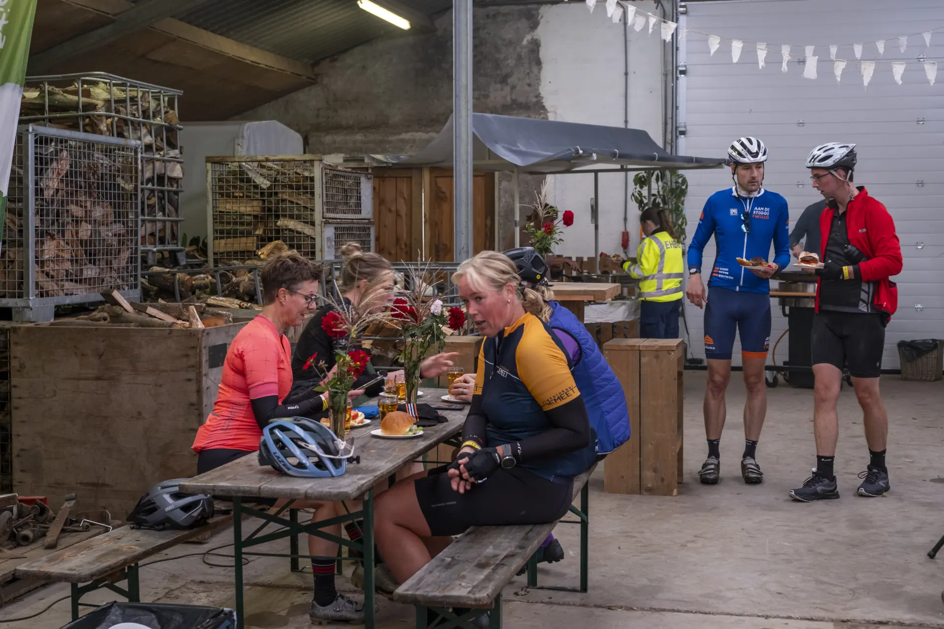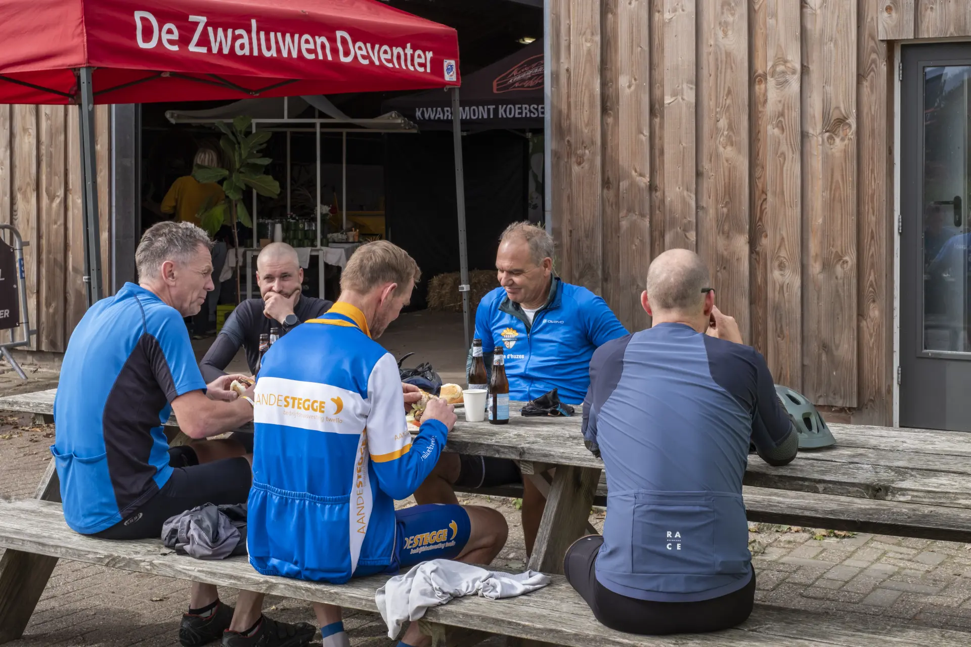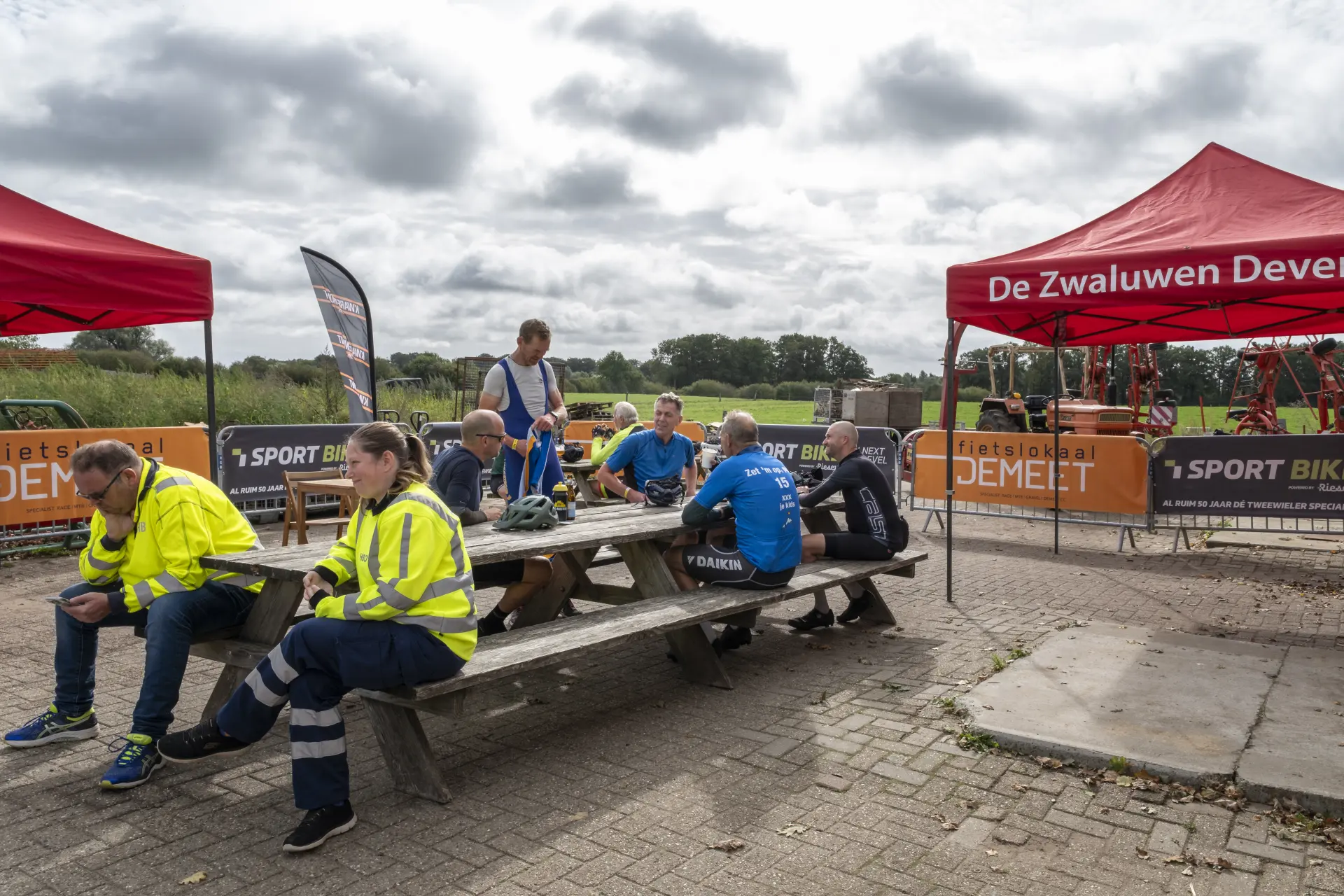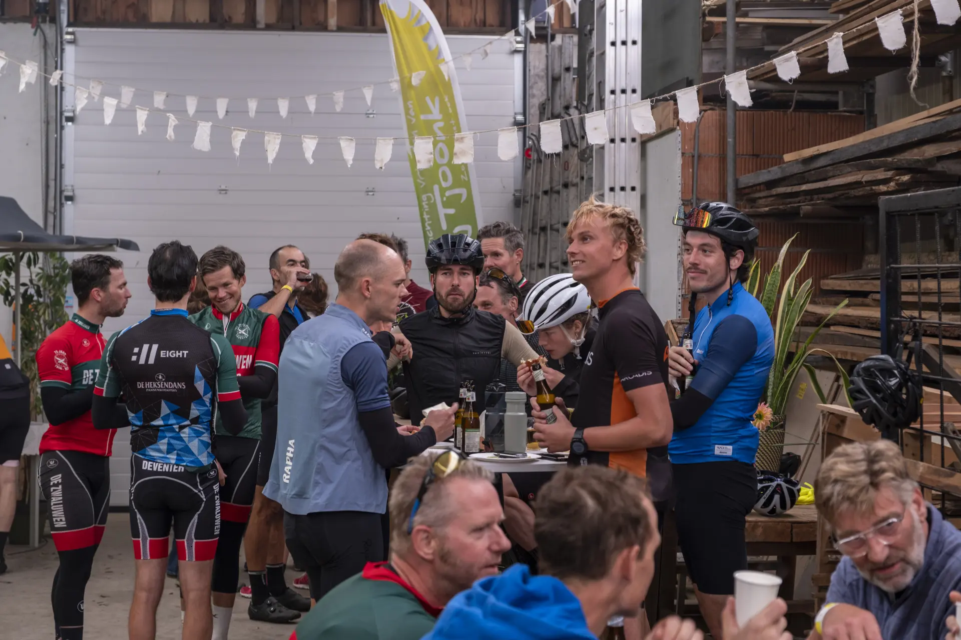 De start en finish waren dit jaar bij leer- en werkbedrijf Bij Tjoonk, waar de locatie fantastisch was aangekleed. Voor de rit eerst samen koffie drinken, na afloop gezellig napraten met live voetbal op het scherm, een drankje in de hand en een sappige hamburger van de grill.